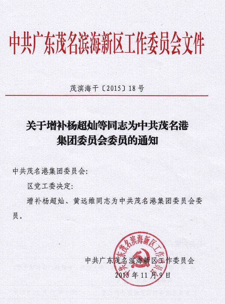 新區(qū)黨工委決定:增補(bǔ)楊超燦、黃遠(yuǎn)維為同志為中共茂名港集團(tuán)委員會(huì)委員.pdf
