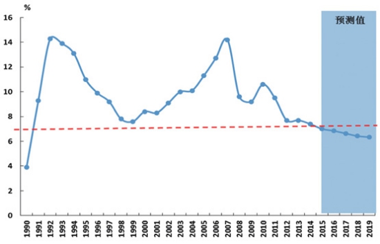 圖3 布倫特原油現(xiàn)貨價(jià)格 3. 技術(shù)孕育新突破,世界經(jīng)貿(mào)構(gòu)筑新格局。 自身發(fā)展規(guī)律和全球經(jīng)濟(jì)調(diào)整都揭示出未來將取得重大技術(shù)突破。從重大技術(shù)突破自身規(guī)律看,當(dāng)前正處于孕育期,盡管突破的核心技術(shù)難以預(yù)測,但可以看到信息化、能源和人工智能以及以美國為代表的生物醫(yī)藥技術(shù),都可以作為孕育突破的溫床。身邊就可以看到的是互聯(lián)網(wǎng)正逐步改變著企業(yè)經(jīng)營和人們的生活消費(fèi),突破了以往的商業(yè)模式。 技術(shù)經(jīng)濟(jì)對比變化和各國戰(zhàn)略調(diào)整,推動(dòng)形成新的經(jīng)貿(mào)格局。為有效應(yīng)對經(jīng)濟(jì)發(fā)展和全球氣候變化面臨的新問題,發(fā)達(dá)國家依托技術(shù)優(yōu)勢,促使經(jīng)濟(jì)逐步復(fù)蘇,并成為世界經(jīng)濟(jì)增長的主要?jiǎng)恿。美國重振制造業(yè)和德國工業(yè)4.0代表著西方國家的制造業(yè)開始重新展現(xiàn)出新的活力,成為經(jīng)濟(jì)復(fù)蘇的重要?jiǎng)恿,同時(shí)以歐盟為代表的發(fā)達(dá)國家依托節(jié)能減排技術(shù)優(yōu)勢,大力推動(dòng)低碳發(fā)展和碳交易,也在重塑世界制造業(yè)貿(mào)易格局,帶動(dòng)發(fā)達(dá)國家重回世界引擎地位。發(fā)展中實(shí)體之間經(jīng)濟(jì)增長也開始出現(xiàn)差異,金磚國家之間分化明顯,預(yù)計(jì)“十三五”期印度經(jīng)濟(jì)年均增速約為6.5%,而巴西、俄羅斯分別降為2.7%和1.8%。世界經(jīng)濟(jì)力量、技術(shù)力量對比的變化,加之地緣政治和各國戰(zhàn)略的調(diào)整,正在推動(dòng)全球形成新的經(jīng)貿(mào)格局,為適應(yīng)這種變化,美國通過主導(dǎo)的TPP、TTIP意在構(gòu)筑國際貿(mào)易的新規(guī)則 TPP,與此相對應(yīng),我國也通過全面推進(jìn)自由貿(mào)易區(qū)和“一帶一路”戰(zhàn)略,來適應(yīng)國際形勢變化,調(diào)整國家戰(zhàn)略。 “十三五”我國經(jīng)貿(mào)發(fā)展特點(diǎn) 1.我國經(jīng)濟(jì)轉(zhuǎn)向中速增長階段,經(jīng)濟(jì)結(jié)構(gòu)發(fā)生轉(zhuǎn)折性變化。 經(jīng)濟(jì)進(jìn)入中速增長階段。圖5顯示了1990年以來我國經(jīng)濟(jì)增速的變化。2000-2010年我國經(jīng)濟(jì)、對外貿(mào)易分別保持了年均10.5%和20.2%的增長,2010年后呈現(xiàn)逐步放緩態(tài)勢,2014年降為7.4%。當(dāng)前,我國經(jīng)貿(mào)發(fā)展面臨十分復(fù)雜的國際環(huán)境,內(nèi)部則處于“三期”疊加期。隨著新型工業(yè)化、信息化、農(nóng)業(yè)現(xiàn)代化和城鎮(zhèn)化“新四化”的不斷推進(jìn),以及市場機(jī)遇、投資機(jī)遇、綠色機(jī)遇和對外合作機(jī)遇的不斷擴(kuò)大,為我國經(jīng)濟(jì)增長提供了巨大潛力和回旋空間。這些發(fā)展環(huán)境變化使我國經(jīng)濟(jì)發(fā)展進(jìn)入新常態(tài),預(yù)計(jì)2015年GDP增長約7%,“十三五”期間經(jīng)濟(jì)平均增速只要保持在6.6%(如圖5所示),即可實(shí)現(xiàn) 2020年GDP總量比2010年翻一番的戰(zhàn)略目標(biāo),按照人均GDP水平測算,我國將進(jìn)入高收入國家行列,對海運(yùn)需求質(zhì)量將全面提高。
