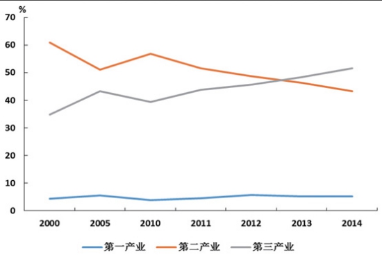 圖5 我國GDP增速變化 產(chǎn)業(yè)與區(qū)域經(jīng)濟(jì)結(jié)構(gòu)調(diào)整,第三產(chǎn)業(yè)成為經(jīng)濟(jì)增長的主要?jiǎng)恿。隨著經(jīng)濟(jì)社會(huì)的進(jìn)步,經(jīng)濟(jì)結(jié)構(gòu)不斷優(yōu)化,第三產(chǎn)業(yè)所占比重逐步提高,并于2013年首次超過第二產(chǎn)業(yè)(如圖6所示)。未來,經(jīng)濟(jì)將進(jìn)入中速增長階段,而第三產(chǎn)業(yè)可望保持相對較快的增長,占GDP比重持續(xù)提高,結(jié)構(gòu)不斷優(yōu)化。從三駕馬車的貢獻(xiàn)來看,外貿(mào)和投資的作用逐漸減弱,經(jīng)濟(jì)增長主要依托消費(fèi)的增長。消費(fèi)的增長并不能像第二產(chǎn)業(yè)那樣直接拉動(dòng)運(yùn)輸需求量的增長,這一態(tài)勢使得運(yùn)輸需求對GDP增速彈性減弱。 經(jīng)濟(jì)增速整體放緩與個(gè)別產(chǎn)業(yè)快速增長并存。從產(chǎn)業(yè)發(fā)展角度來看,無論是從國家深化改革,還是實(shí)體經(jīng)濟(jì)發(fā)展,要素資本的作用正逐步減小,制度資本的作用開始顯現(xiàn),創(chuàng)新發(fā)展開始優(yōu)于要素的投入,表現(xiàn)為在我國經(jīng)濟(jì)增速整體放緩的背景下,各產(chǎn)業(yè)之間開始呈現(xiàn)明顯分化,如電商業(yè)務(wù)、快遞業(yè)務(wù)等開始出現(xiàn)爆發(fā)式的增長。從企業(yè)效益看,近年來,盡管我國企業(yè)整體的回報(bào)在下降,但是少數(shù)產(chǎn)業(yè)回報(bào)依然保持較高水平。