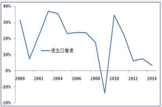 圖7 沿海地區(qū)(含北京)占全國GDP比重 2.對外貿(mào)易彈性下降,貿(mào)易伙伴多元化。 外貿(mào)保持穩(wěn)定增長,與經(jīng)濟(jì)彈性進(jìn)一步下降。在加入WTO的帶動(dòng)下,2000-2007年我國外貿(mào)進(jìn)出口總額保持了24.3%的年均增長(如圖8所示),與 GDP的彈性系數(shù)高達(dá)2.25,明顯高出世界1.5的平均水平,成為世界重要經(jīng)貿(mào)大國。受到金融危機(jī)沖擊和全球貿(mào)易放緩的影響,面對國內(nèi)外復(fù)雜形勢,2007-2014年我國對外貿(mào)易仍保持較快發(fā)展,外貿(mào)進(jìn)出口總額年均增速達(dá)到10.2%,國際貿(mào)易地位不斷提高,成為世界第一貨物貿(mào)易大國。隨著貿(mào)易依賴度的提高,進(jìn)出口彈性逐步下降,由2.25下降為1.16!笆濉逼陂g我國對外貿(mào)易發(fā)展將面臨更加復(fù)雜的國際環(huán)境,將逐步轉(zhuǎn)入平穩(wěn)發(fā)展階段,與 GDP的彈性下降為1.0,外貿(mào)進(jìn)出口總額增速保持在6.6%與GDP相當(dāng)?shù)乃健?BR> 貿(mào)易區(qū)域結(jié)構(gòu)不斷優(yōu)化,貿(mào)易伙伴保持多元化趨勢。隨著我國經(jīng)濟(jì)社會(huì)發(fā)展水平的提高,貿(mào)易呈現(xiàn)多元化發(fā)展趨勢,特別是金融危機(jī)后,亞洲、歐洲和北美洲占貿(mào)易比重由2007年的89.6%逐步降為2014年的85.1%,美國、歐盟和日本所占比重由41.1%降為34.4%,而非洲、拉丁美洲所占貿(mào)易比重則由 8.1%上升為11.3%。隨著世界貿(mào)易格局的調(diào)整,以及我國“一帶一路”戰(zhàn)略的推進(jìn),對外貿(mào)易結(jié)構(gòu)將進(jìn)一步優(yōu)化,與東盟、非洲等海上絲綢之路沿線國家貿(mào)易比重進(jìn)一步上升。