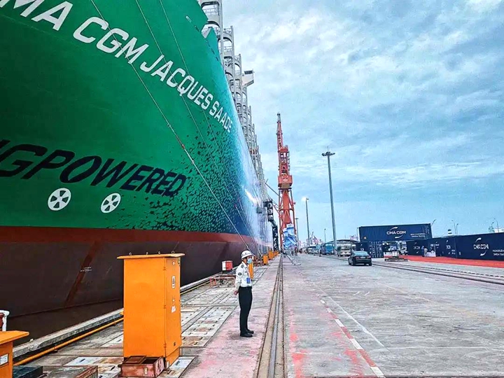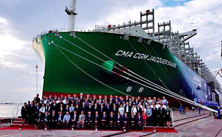 9月22日,中國船舶集團有限公司旗下滬東中華造船(集團)有限公司和中國船舶工業(yè)貿(mào)易有限公司作為聯(lián)合賣方,為世界著名航運公司——法國達飛集團建造的世界首艘23000TEU雙燃料動力集裝箱船“達飛雅克·薩德”號,在上海長興島造船基地命名交付。
