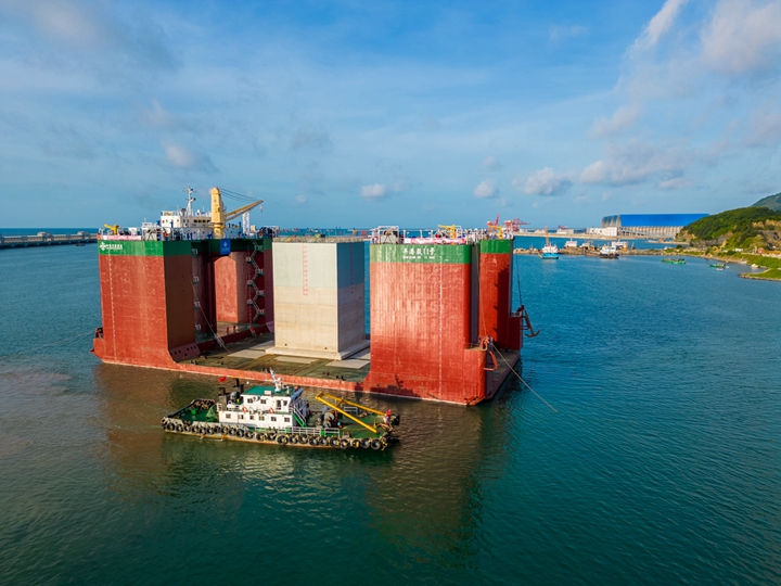 據(jù)悉,本工程采用重力式沉箱結(jié)構(gòu)型式,靠船墩沉箱2個(gè),系纜墩沉箱6個(gè),其中最大的沉箱重達(dá)6500噸。本次首個(gè)出運(yùn)的沉箱長(zhǎng)18.3米,寬16.8米,高23.8米,重3052噸,于6月30日順利上塢,通過(guò)10000噸級(jí)的“半潛11”號(hào)半潛駁起浮拖運(yùn)至施工區(qū)域,使用GPS定點(diǎn)測(cè)量技術(shù),控制其下潛安裝至指定位置。項(xiàng)目建成后將進(jìn)一步降低茂名港腹地企業(yè)原油運(yùn)輸成本,還吸引和集聚大型石油化工企業(yè)落戶,推動(dòng)茂名地區(qū)經(jīng)濟(jì)高質(zhì)量發(fā)展,為茂名制造業(yè)當(dāng)家發(fā)展戰(zhàn)略注入新動(dòng)能。