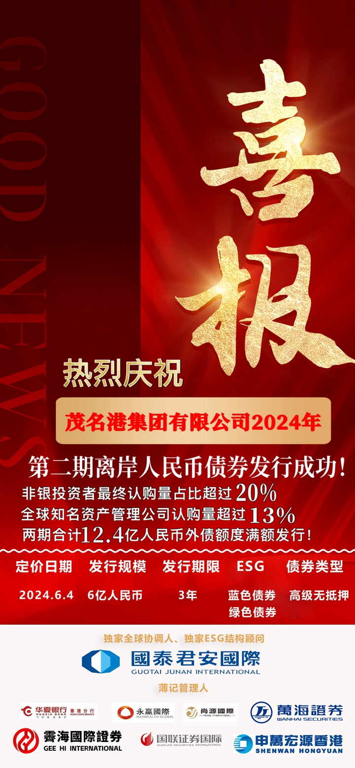 6月4日,茂名港集團有限公司成功定價2024年第二期境外人民幣債券,在港交所、澳交所掛牌,發(fā)行規(guī)模6億人民幣,茂名港集團兩期共12.4億人民幣境外債額度圓滿發(fā)行成功。兩期債券獲得綠色債券和藍色債券雙重認證,作為全國首筆“藍標+綠標”境外債券,為茂名市清潔能源、綠色交通、可持續(xù)發(fā)展的新質(zhì)生產(chǎn)力等重要領(lǐng)域提供了資金支持。