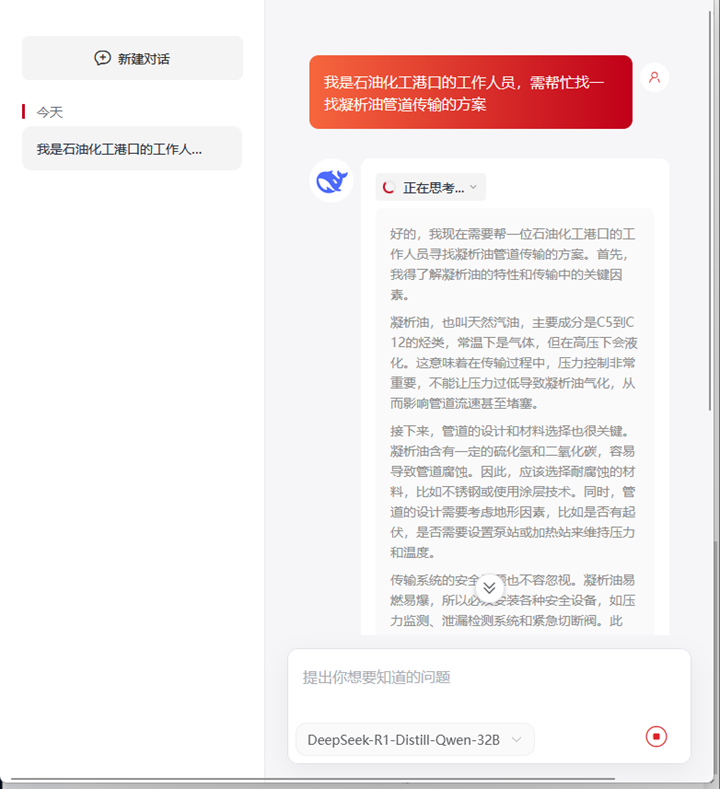 Deepseek大模型作為國內(nèi)頂尖的人工智能技術(shù),具備強(qiáng)大的自然語言處理、數(shù)據(jù)分析與互聯(lián)網(wǎng)搜索能力。此次集成將Deepseek的大模型接口嵌入綜合調(diào)度業(yè)務(wù)系統(tǒng),通過懸浮按鈕“港航智匯”,一鍵喚醒AI大腦,直連Deepseek,實(shí)現(xiàn)大屏端業(yè)務(wù)全場(chǎng)景智能對(duì)話。這一創(chuàng)新設(shè)計(jì)使港口調(diào)度人員能夠?qū)崟r(shí)獲取港航領(lǐng)域的精準(zhǔn)業(yè)務(wù)搜索、智能咨詢與深度分析服務(wù),顯著提升了工作效率與決策能力,為港口調(diào)度業(yè)務(wù)的智能化升級(jí)注入了全新動(dòng)力。并且,“港航智匯”可自動(dòng)保存歷史搜索記錄,方便用戶隨時(shí)查看和回溯,提升操作便捷性與工作效率。